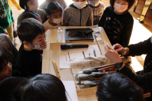 まず始めに、硯、下敷き、筆、文鎮などの書道で使う道具を見せて下さいました。
