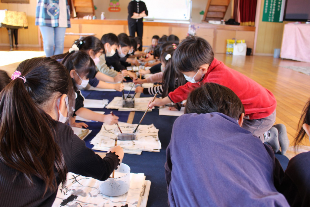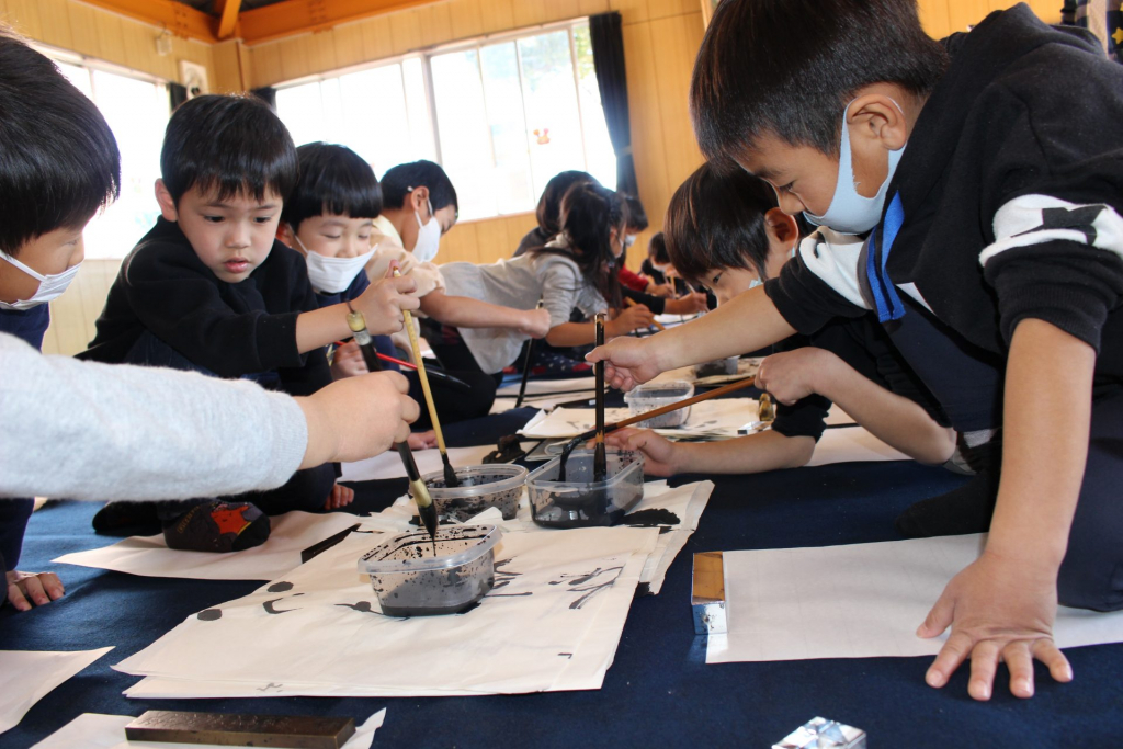 子どもたちは、臆することなく、墨をたっぷり付けて堂々と紙に筆を走らせていました。
