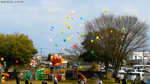 子どもたちの夢を乗せて、子どもたち、職員、保護者の皆様方と一緒に、快晴の大空に向かって風船飛ばしをしました。