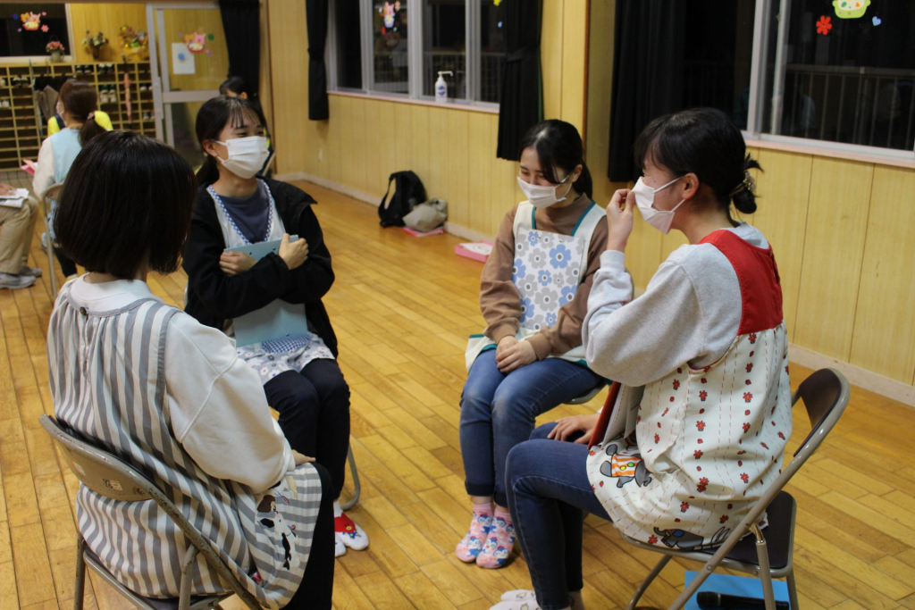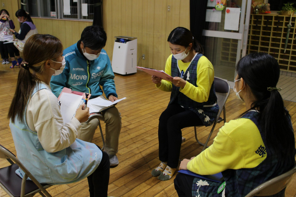 グループワーク開始前に、4人のスタッフに先日のおゆうぎ会の裏話のエピソードを発表してもらいました。舞台では表面化されない、おゆうぎ会本番までの日々の練習の中で生まれたドラマがいくつも紹介されました。