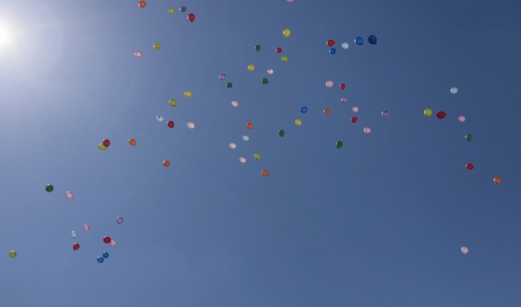 子どもたち、職員、保護者みんなで風船飛ばしをしました。