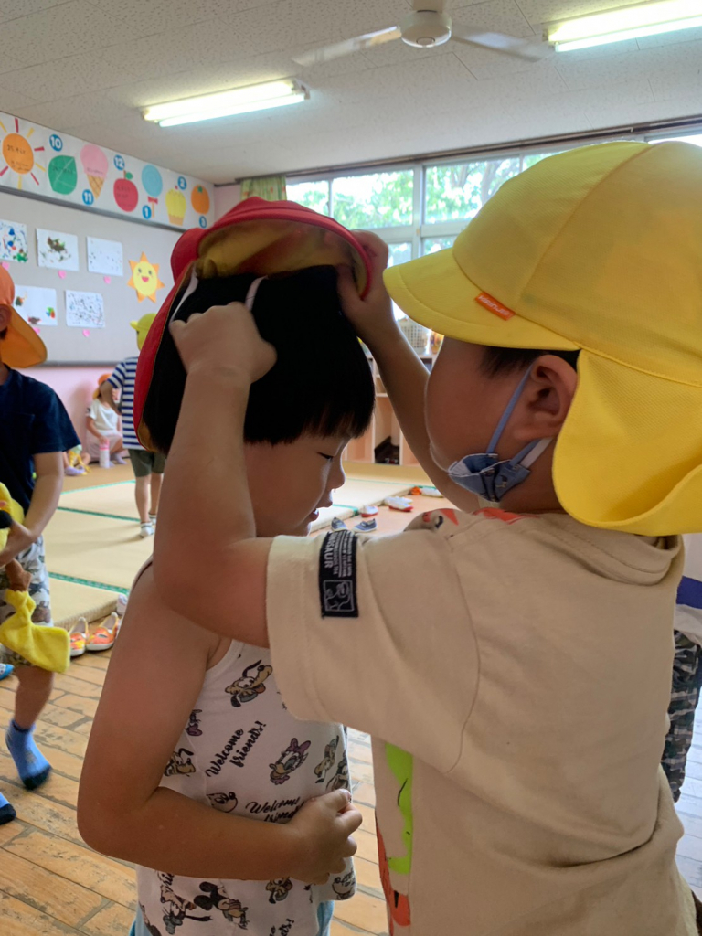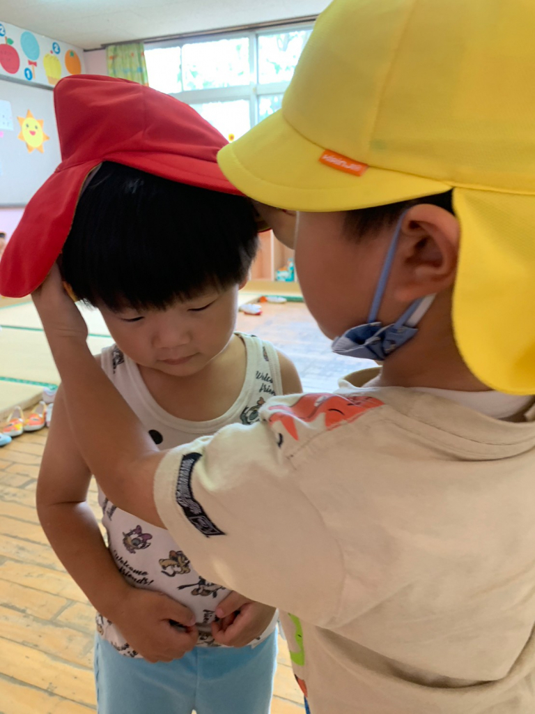 早速、砂場に行く際も、腰を下ろして帽子を被せてあげていました。