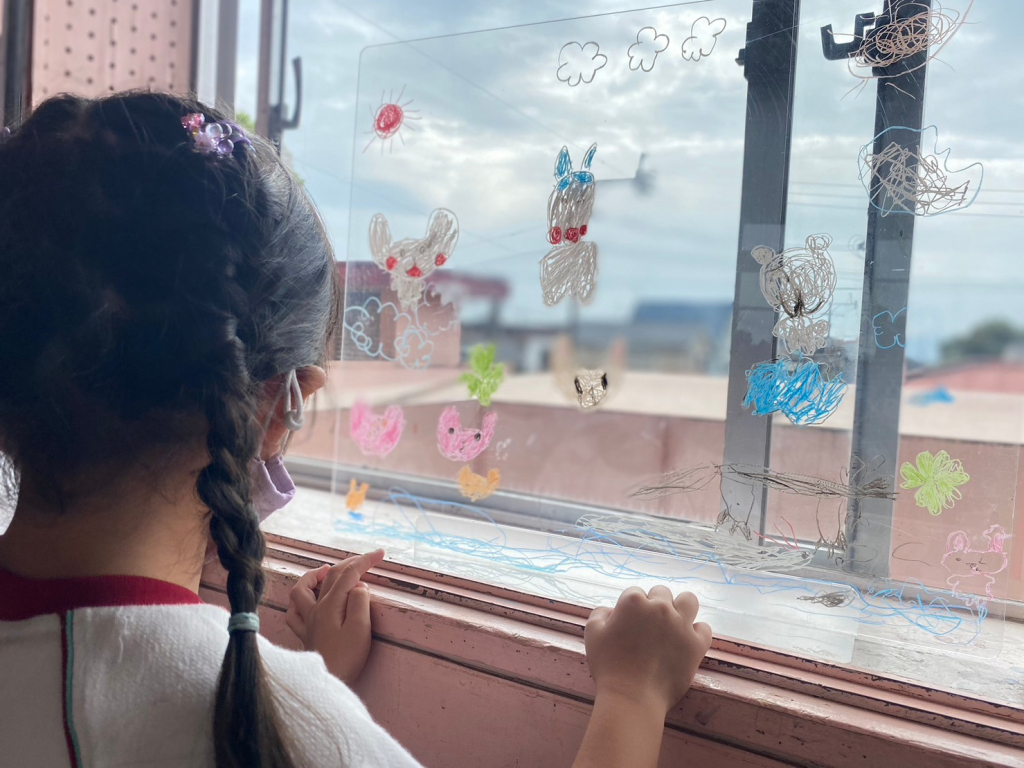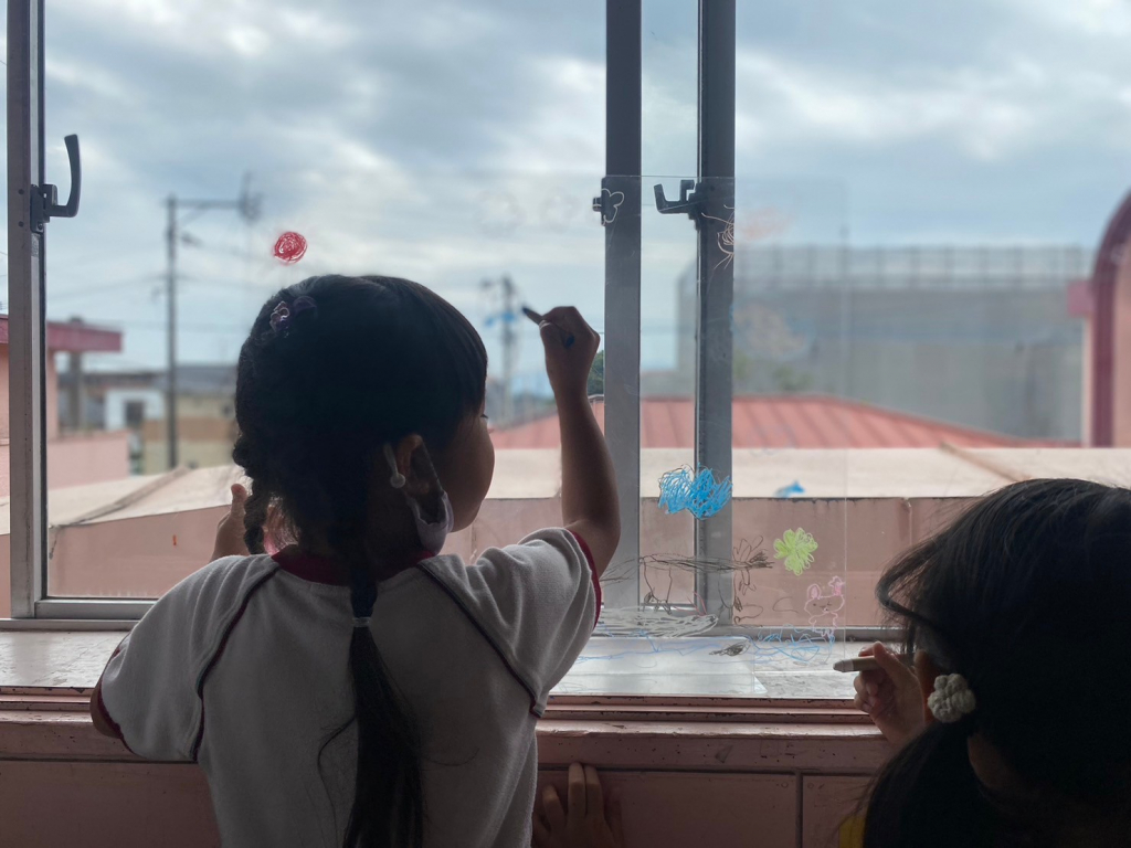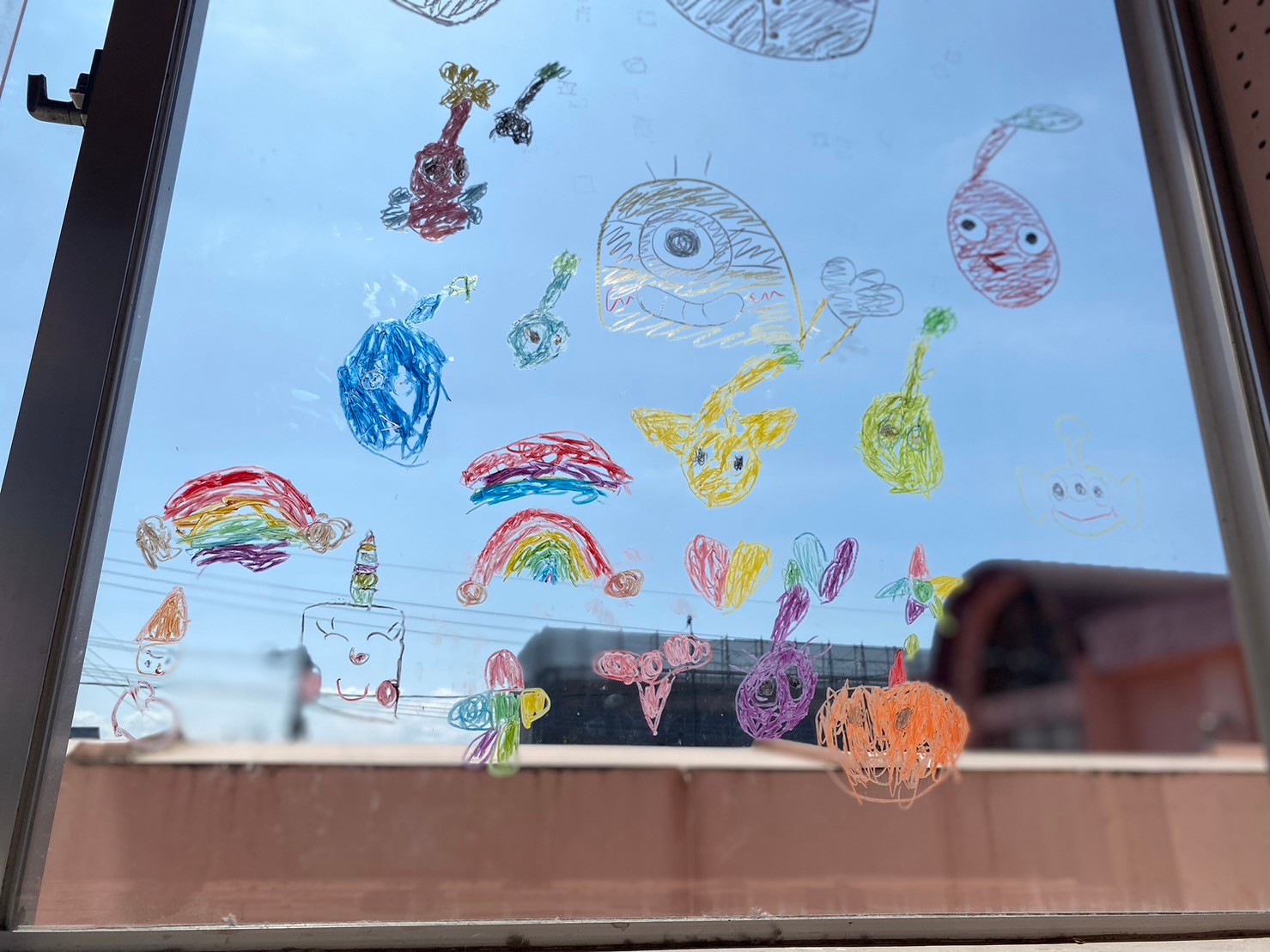 園の窓ガラスに思いきり落書きができる体験。