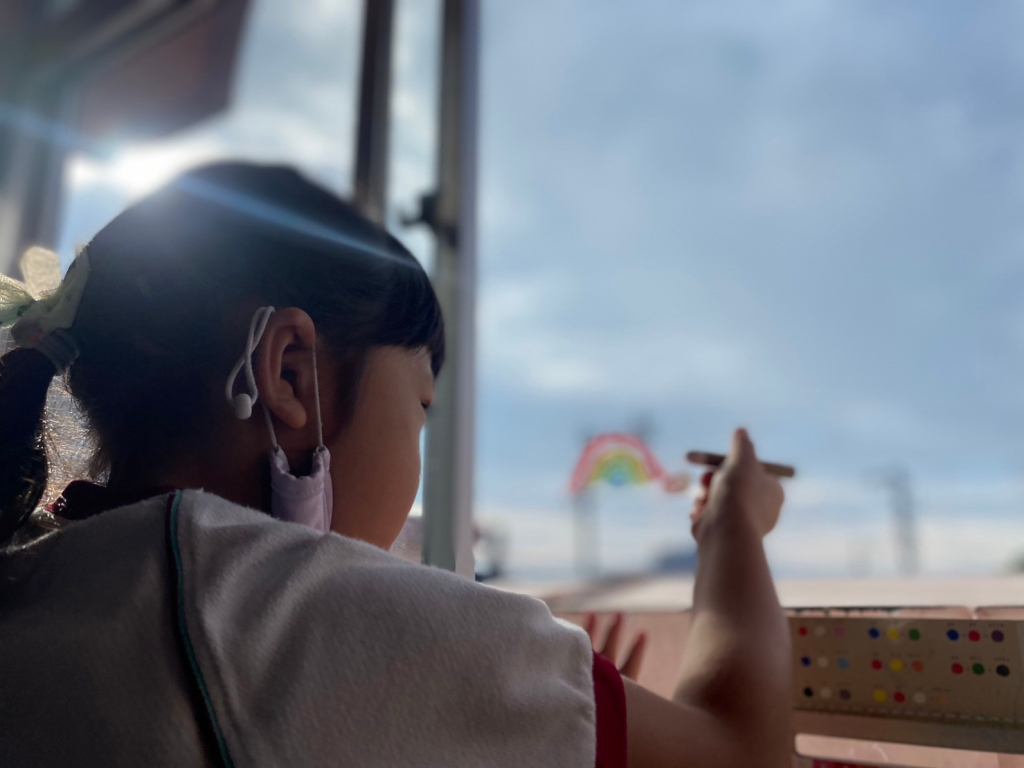 この日は、ガラスに描ける画材を使って、みんな思い思いに絵を描いてみました。