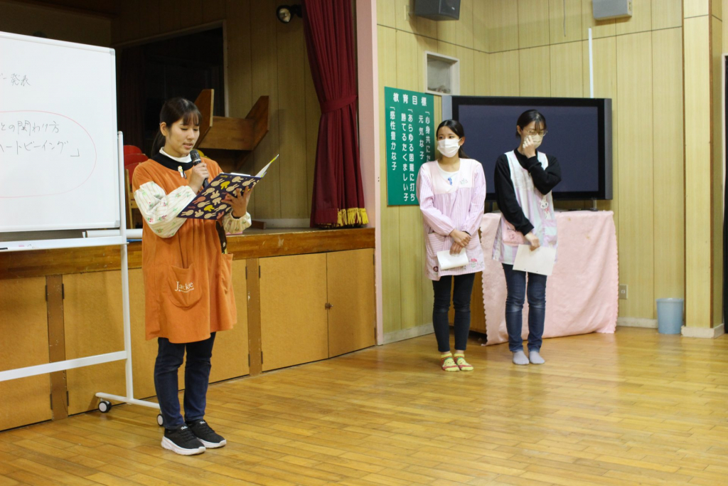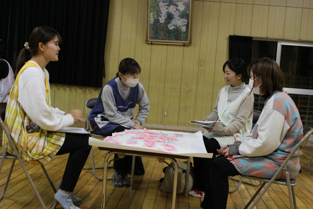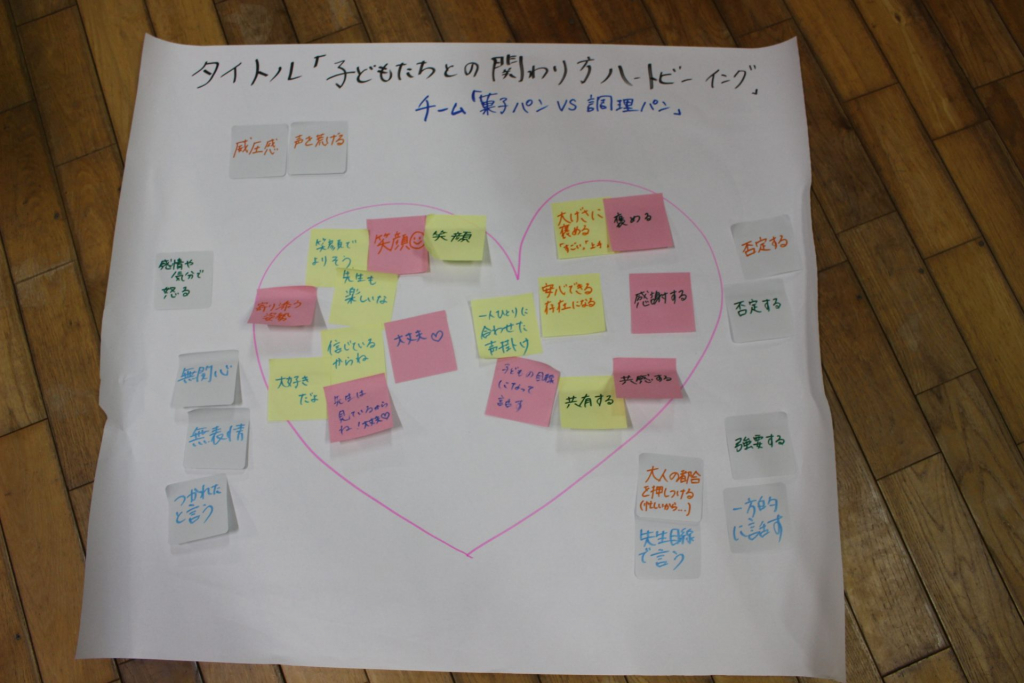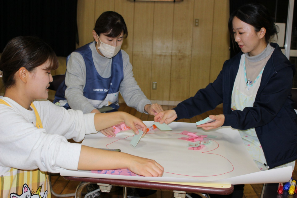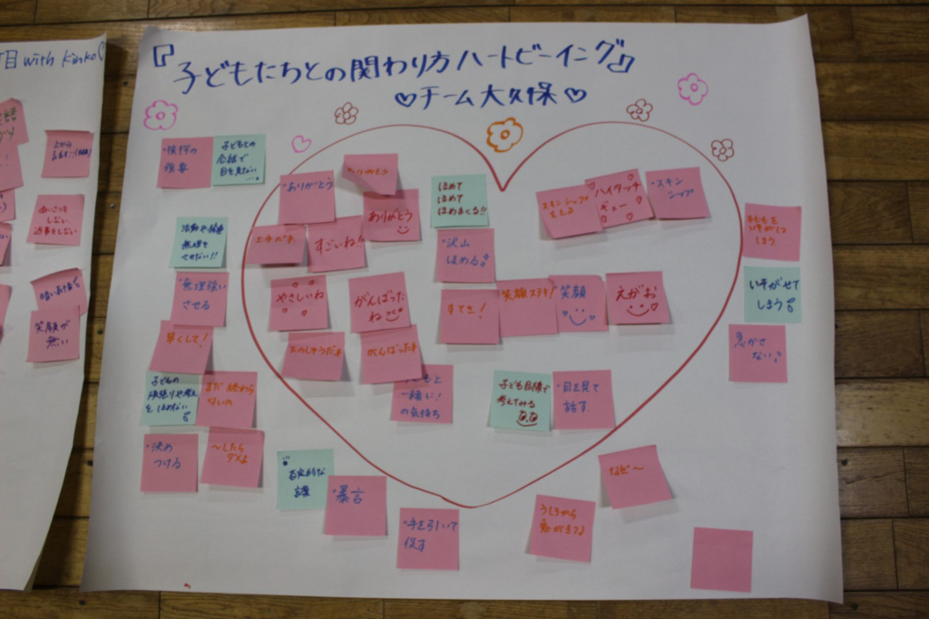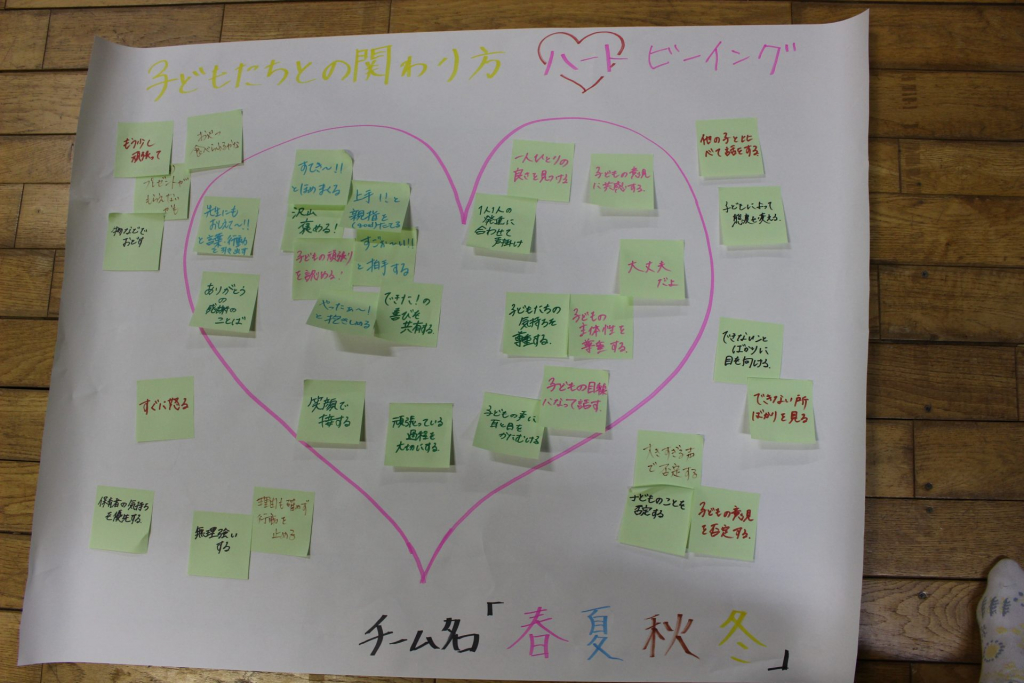 日頃の私たちの子どもへの接し方での大切なこと、NG言動を模造紙に書き出してみると、自分たちに不足していることも気づかされました。より意識して保育に努めたいなと、改めて感じました。