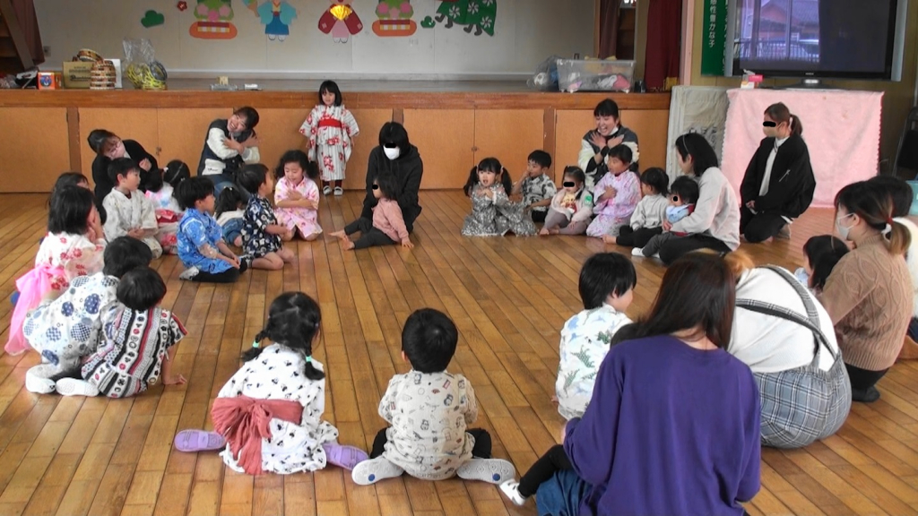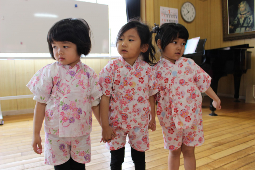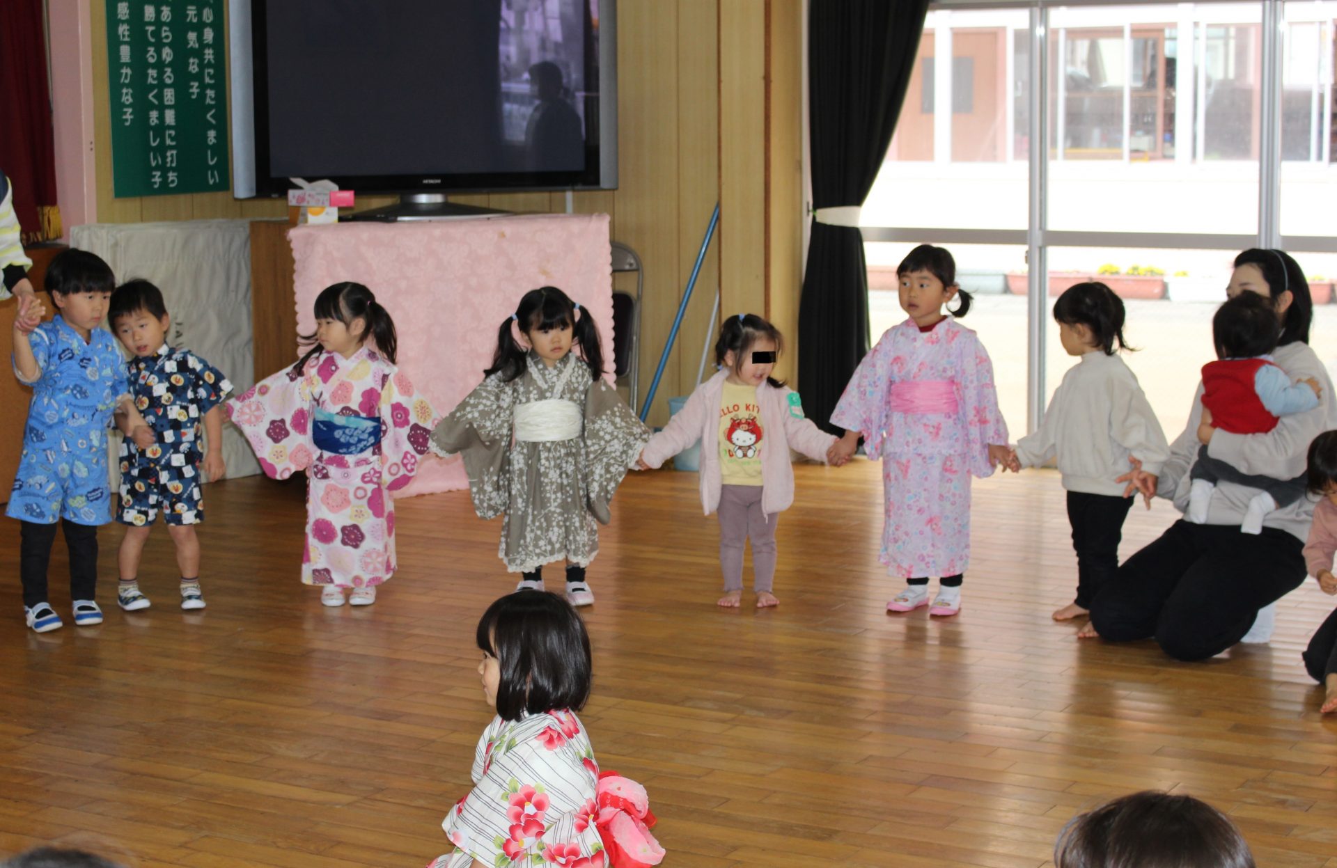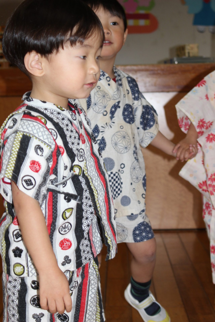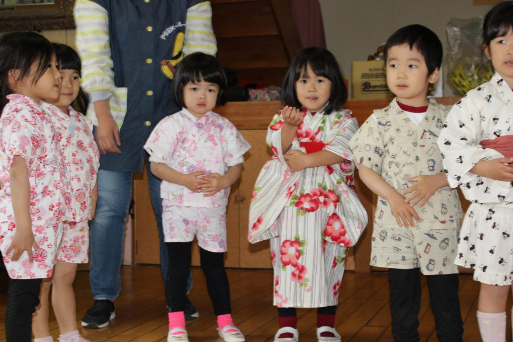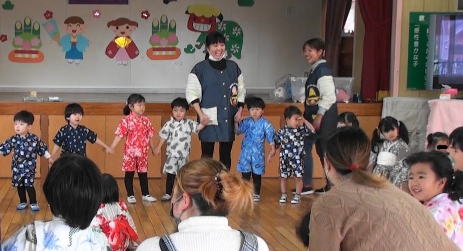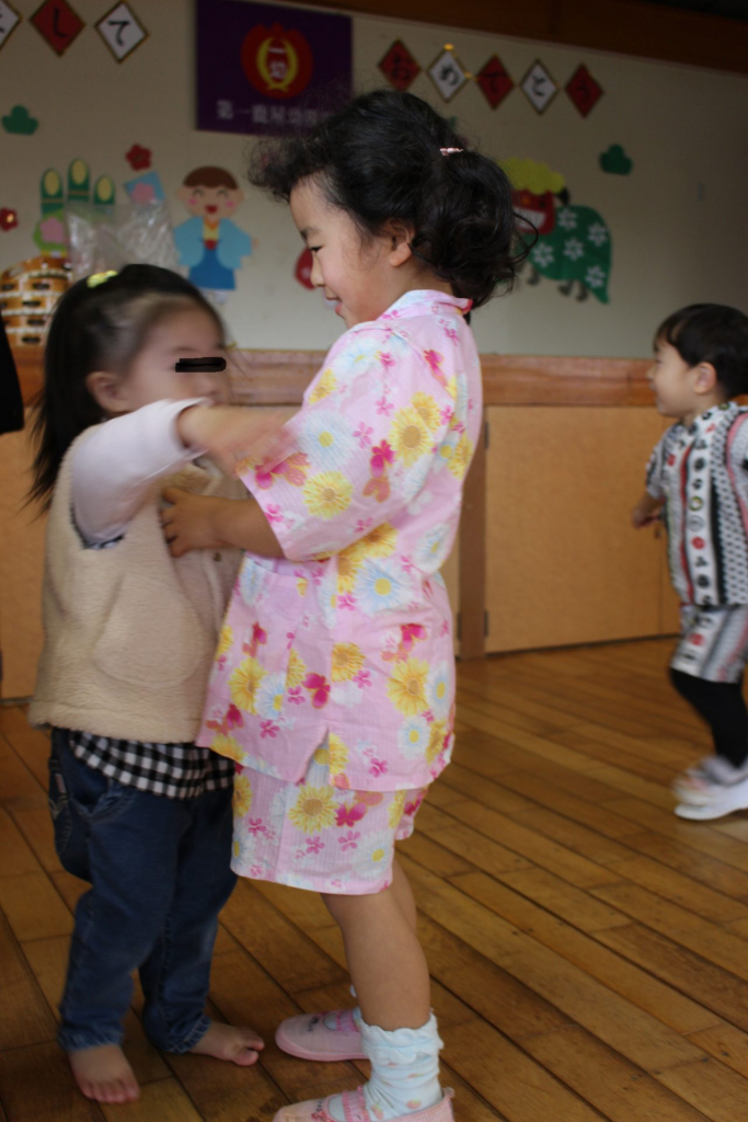 11月のおゆうぎ会“夢ステージ”で披露したように、甚平や浴衣を着て、もも組の子どもたちが登場しました。