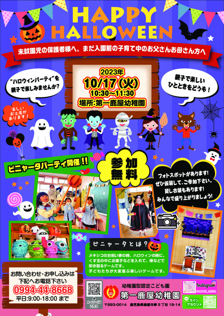 10/17 ハロウィンパーティ 案内状 2023 9/27 先日ご案内しましたハロウィンパーティのチラシです。 当日はぜひ仮装してきて下さい! 会場にも、ハロウィン貸衣装もありますので、ぜひ撮影も楽しんで下さいね!